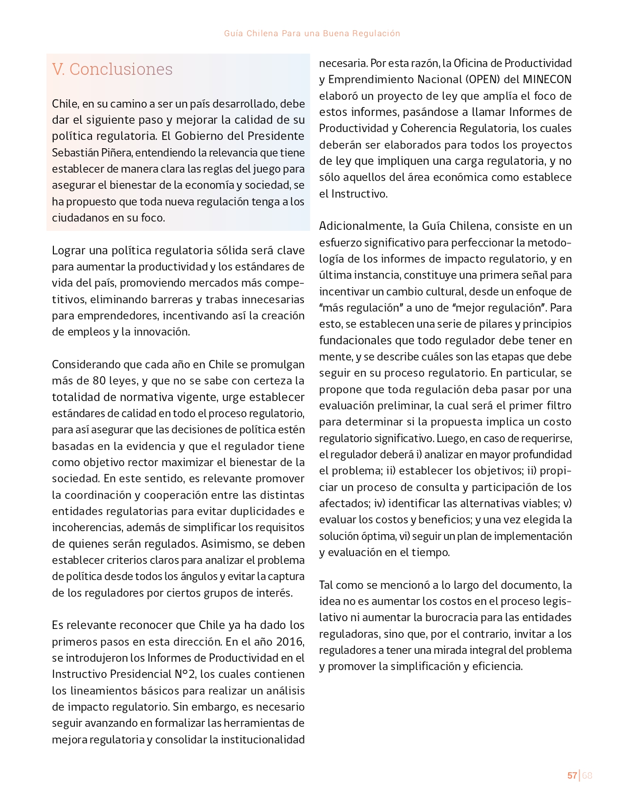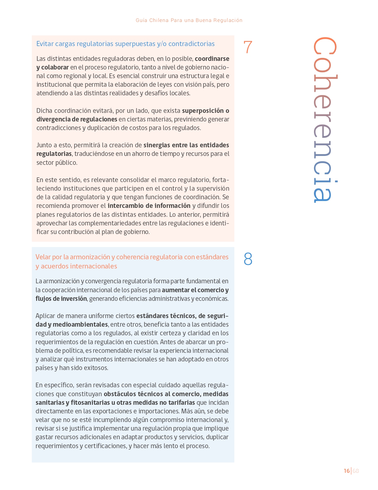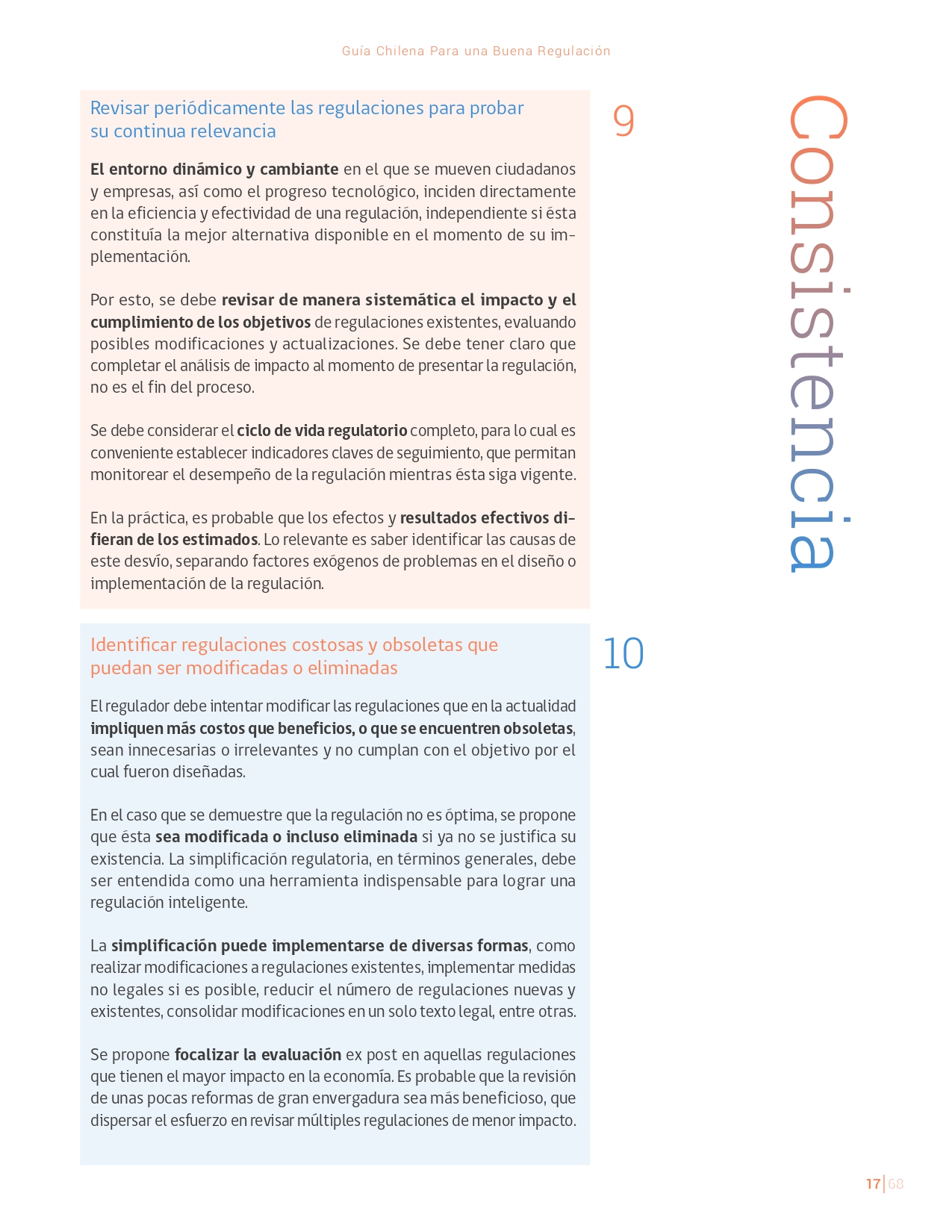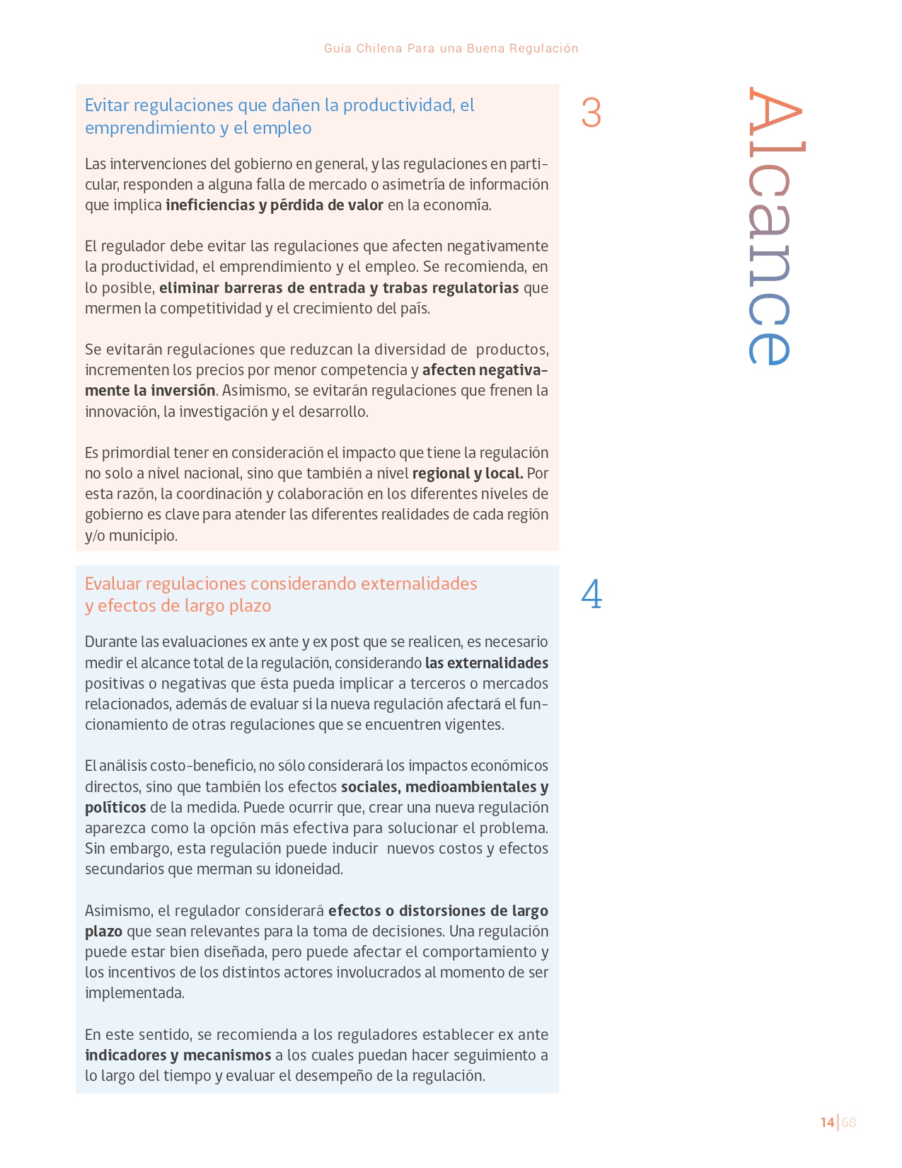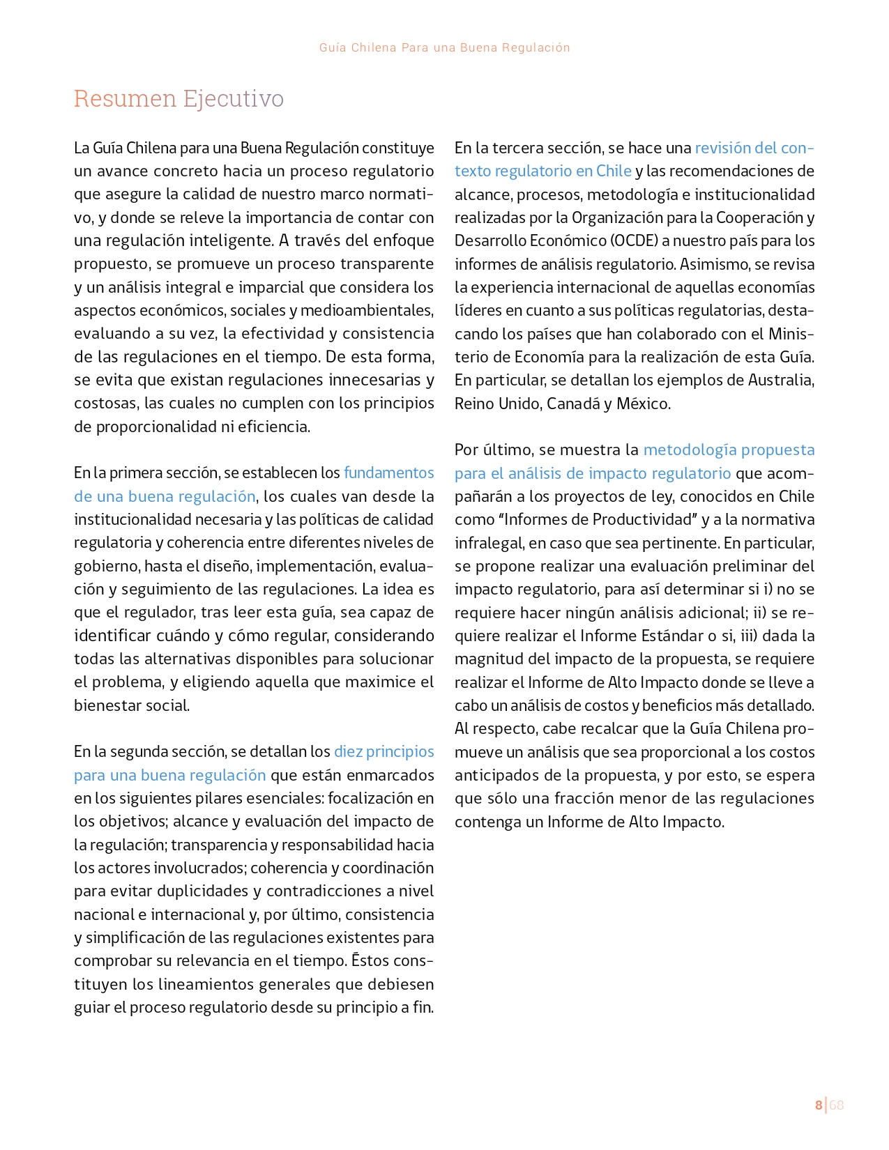 La Guía Chilena para una Buena regulación tiene como objetivo principal ser una referencia para los reguladores en el país, acompañándolos en las distintas etapas del proceso de creación de nuevas regulaciones. En ésta, se propone un proceso regulatorio transpartente que asegure la calidad de nuestro marco normativo, y dónde se releve la importancia de contar con una regulación inteligente. A través del enfoque propuesto, se promueve un análisis integral e imparcial que considera los aspectos económicos, sociales y medioambientales, evaluando a su vez, la efectividad y consistencia de las regulaciones en el tiempo. De esta forma, se evita que existan regulaciones innecesarias y costosas, las cuales no cumplen con los principios de proporcionalidad y eficiencia.