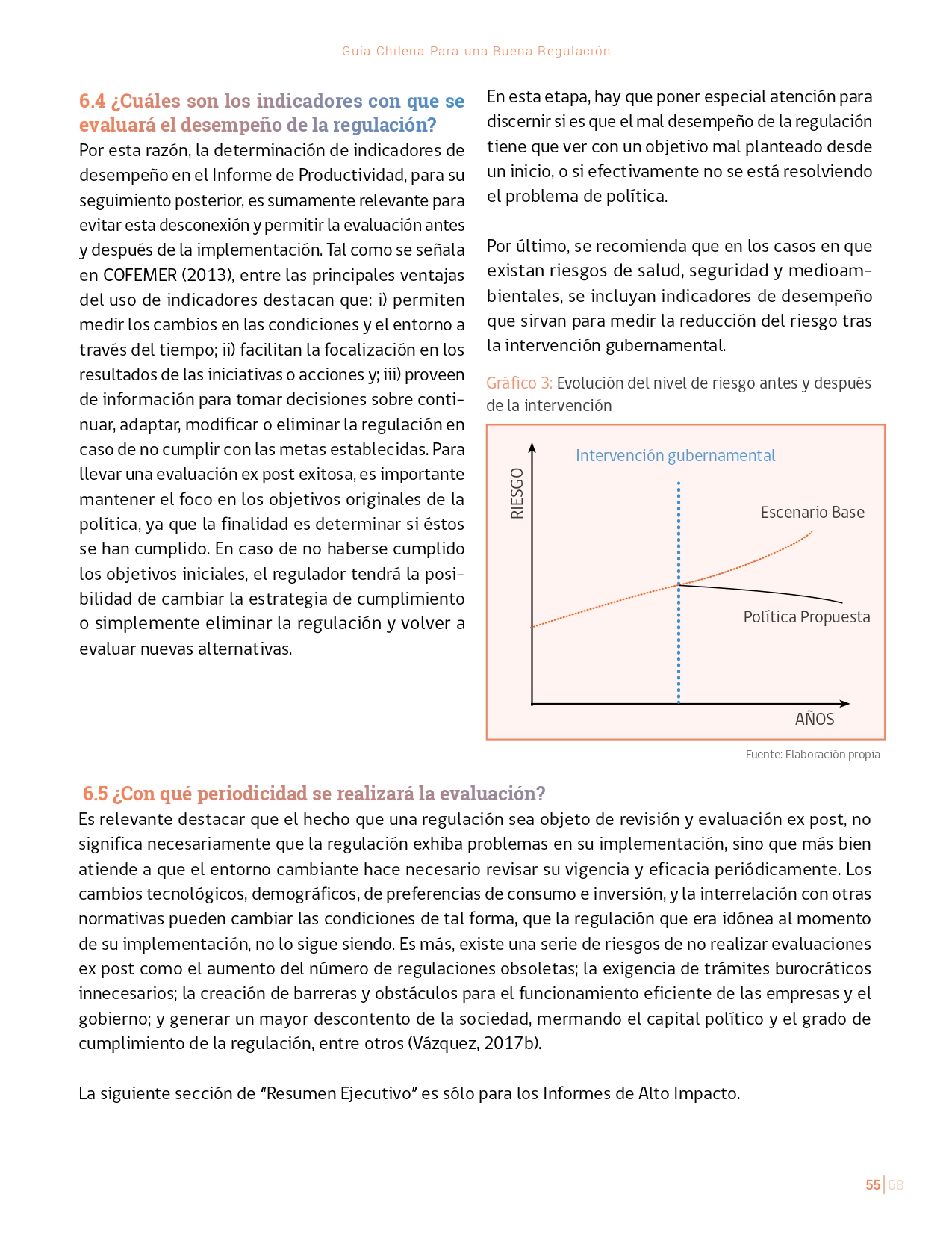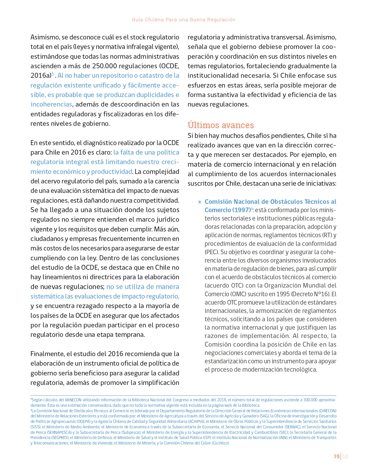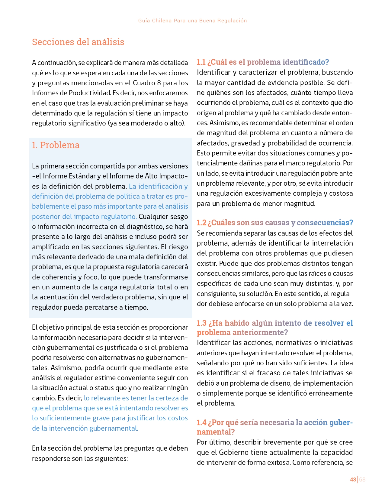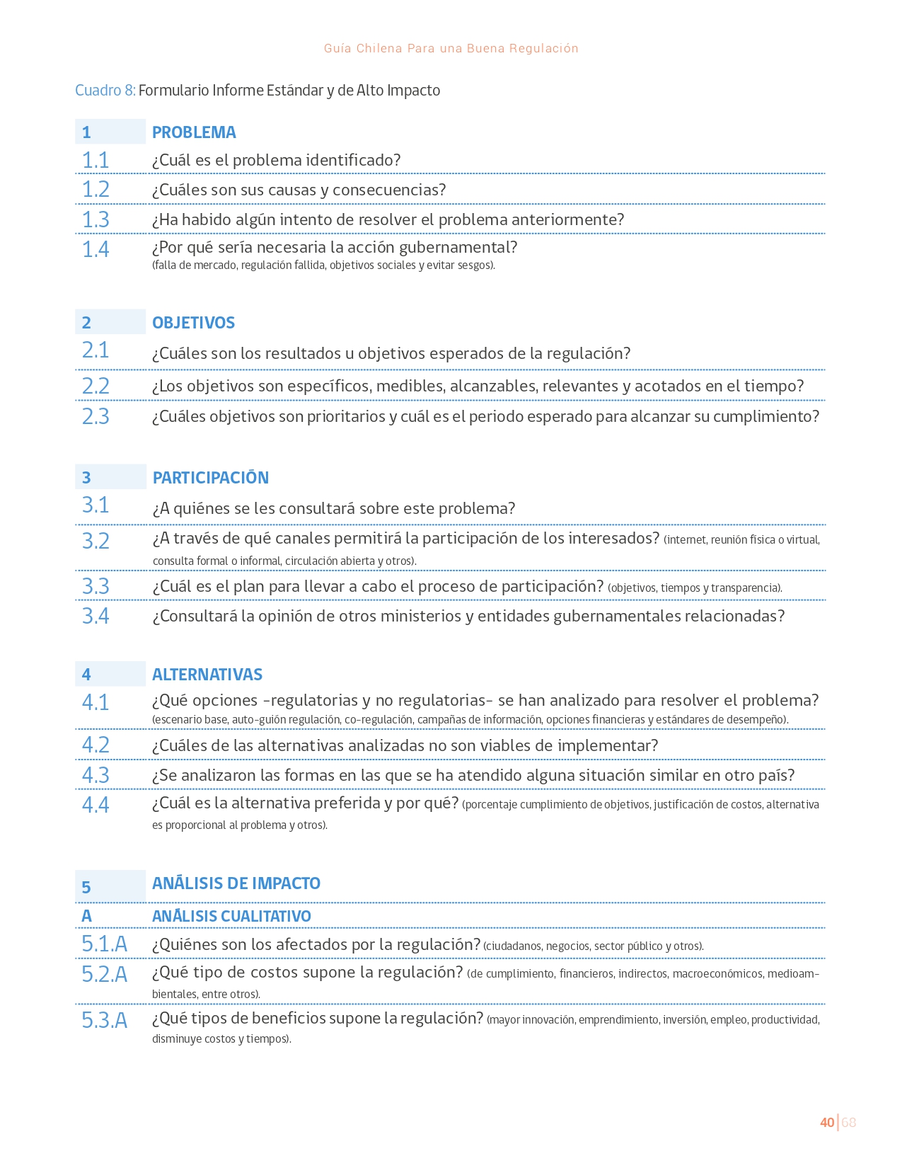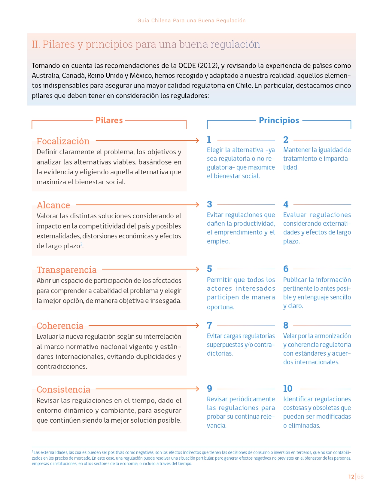 La Guía Chilena para una Buena regulación tiene como objetivo principal ser una referencia para los reguladores en el país, acompañándolos en las distintas etapas del proceso de creación de nuevas regulaciones. En ésta, se propone un proceso regulatorio transpartente que asegure la calidad de nuestro marco normativo, y dónde se releve la importancia de contar con una regulación inteligente. A través del enfoque propuesto, se promueve un análisis integral e imparcial que considera los aspectos económicos, sociales y medioambientales, evaluando a su vez, la efectividad y consistencia de las regulaciones en el tiempo. De esta forma, se evita que existan regulaciones innecesarias y costosas, las cuales no cumplen con los principios de proporcionalidad y eficiencia.