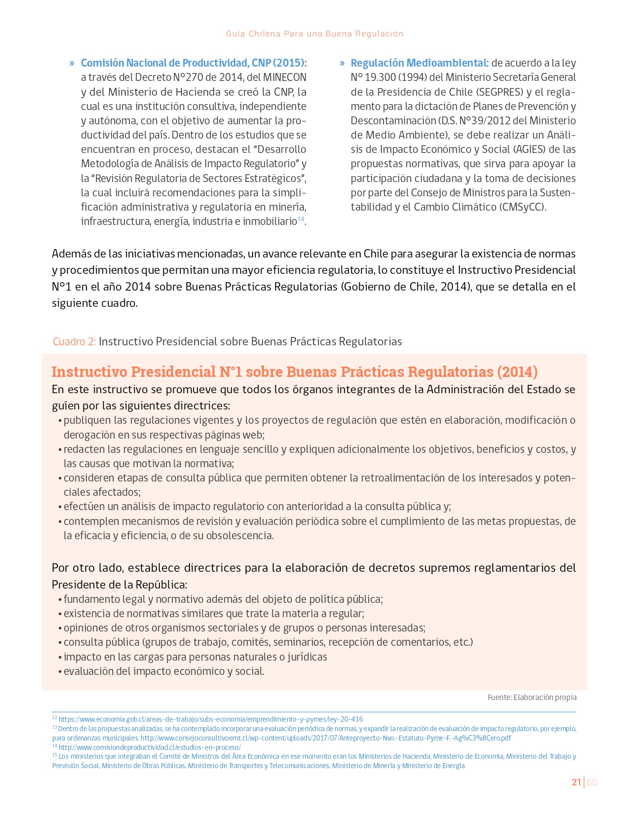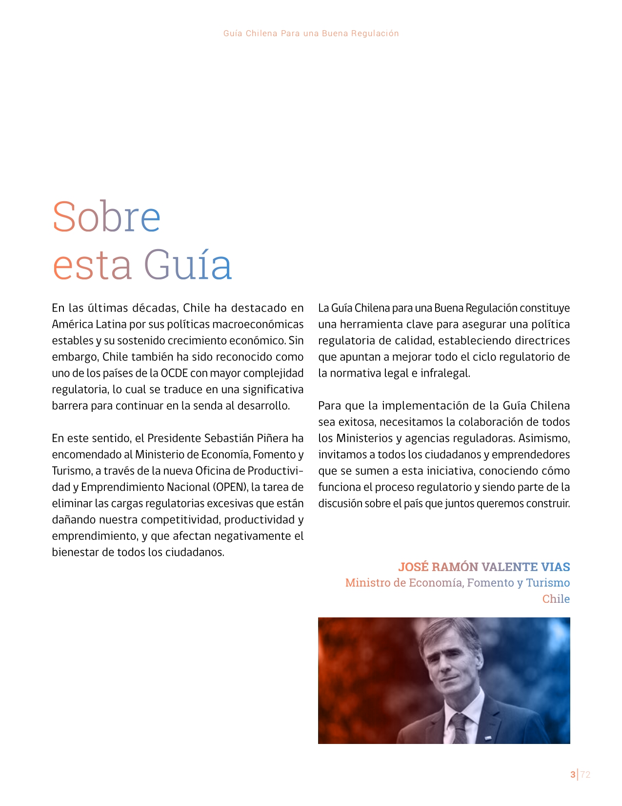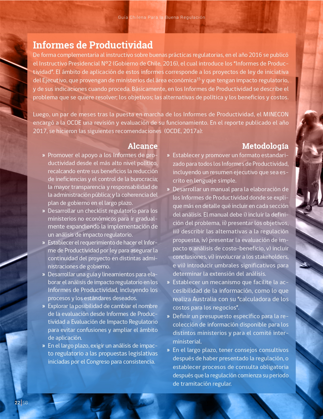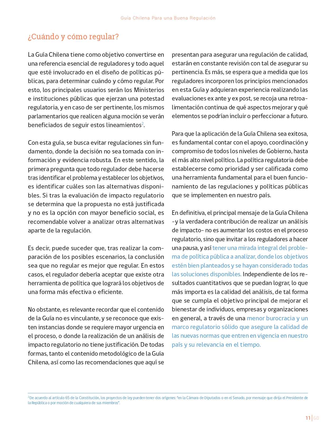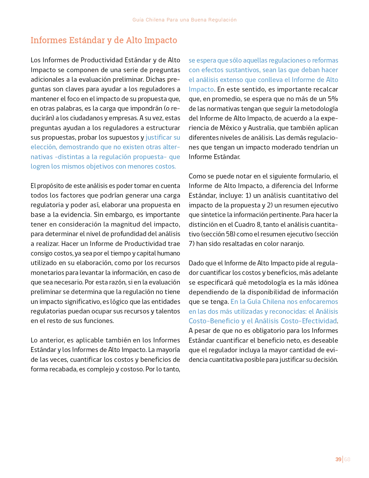 La Guía Chilena para una Buena regulación tiene como objetivo principal ser una referencia para los reguladores en el país, acompañándolos en las distintas etapas del proceso de creación de nuevas regulaciones. En ésta, se propone un proceso regulatorio transpartente que asegure la calidad de nuestro marco normativo, y dónde se releve la importancia de contar con una regulación inteligente. A través del enfoque propuesto, se promueve un análisis integral e imparcial que considera los aspectos económicos, sociales y medioambientales, evaluando a su vez, la efectividad y consistencia de las regulaciones en el tiempo. De esta forma, se evita que existan regulaciones innecesarias y costosas, las cuales no cumplen con los principios de proporcionalidad y eficiencia.