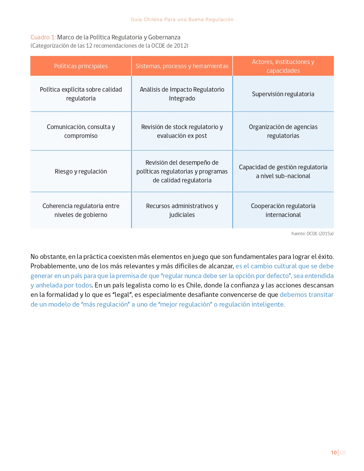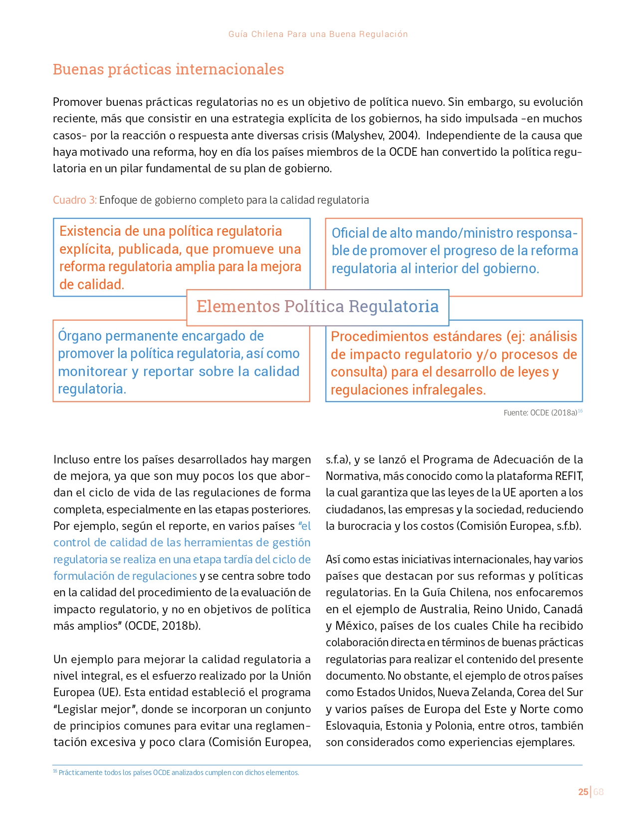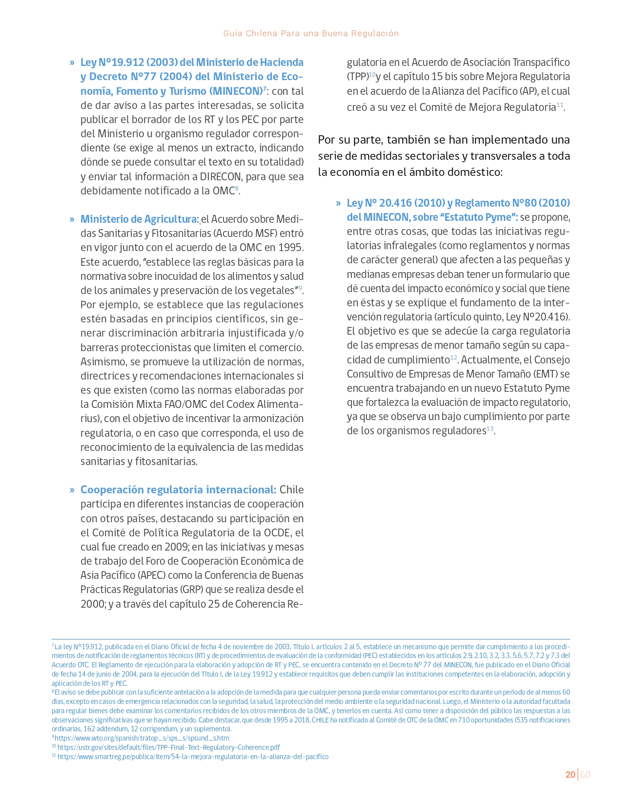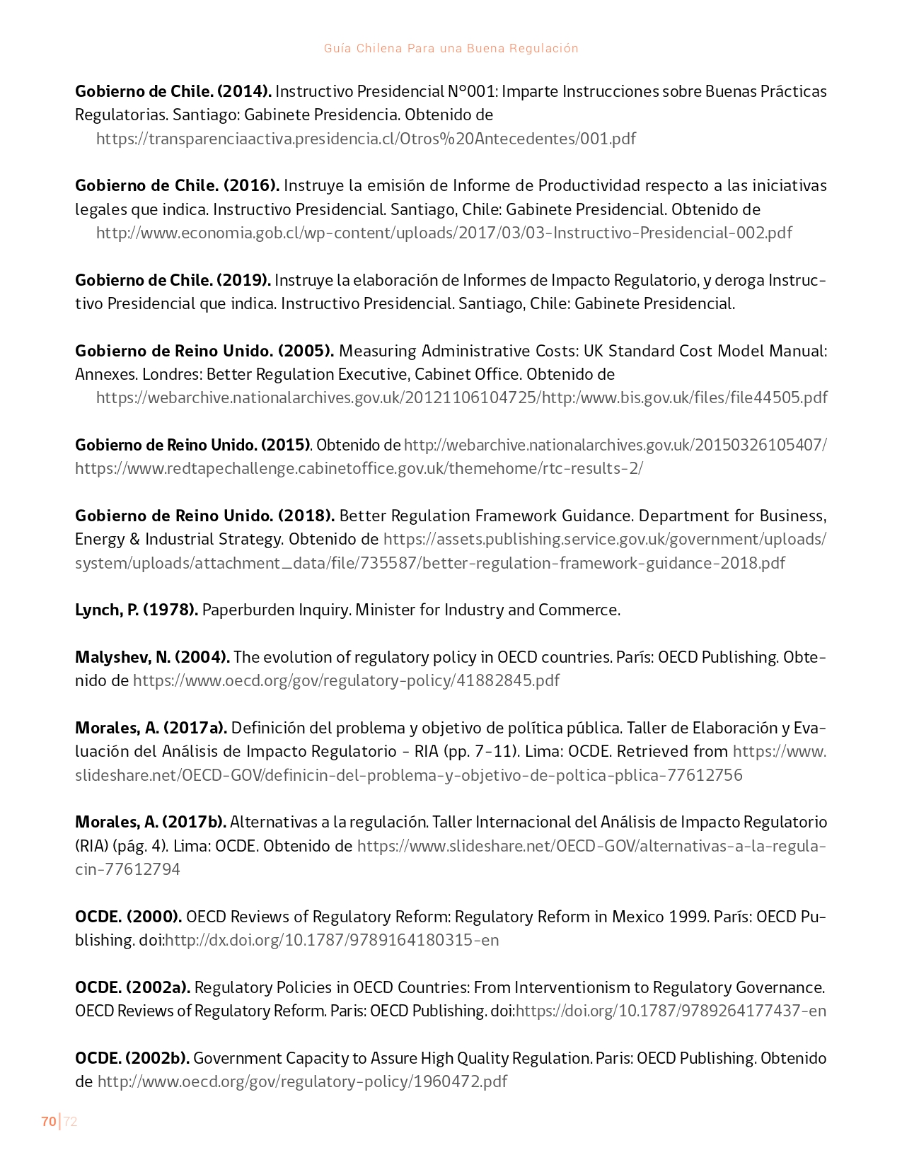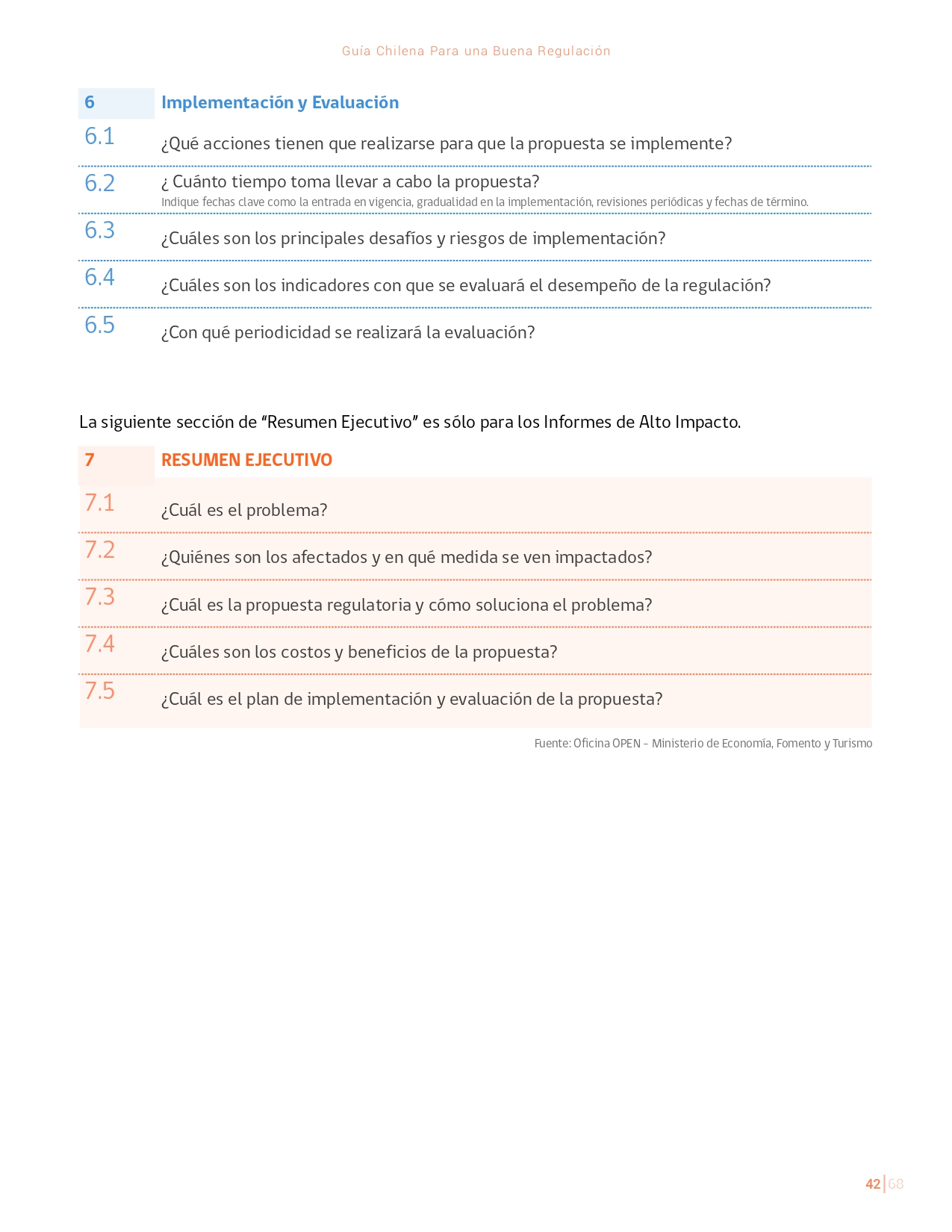 La Guía Chilena para una Buena regulación tiene como objetivo principal ser una referencia para los reguladores en el país, acompañándolos en las distintas etapas del proceso de creación de nuevas regulaciones. En ésta, se propone un proceso regulatorio transpartente que asegure la calidad de nuestro marco normativo, y dónde se releve la importancia de contar con una regulación inteligente. A través del enfoque propuesto, se promueve un análisis integral e imparcial que considera los aspectos económicos, sociales y medioambientales, evaluando a su vez, la efectividad y consistencia de las regulaciones en el tiempo. De esta forma, se evita que existan regulaciones innecesarias y costosas, las cuales no cumplen con los principios de proporcionalidad y eficiencia.