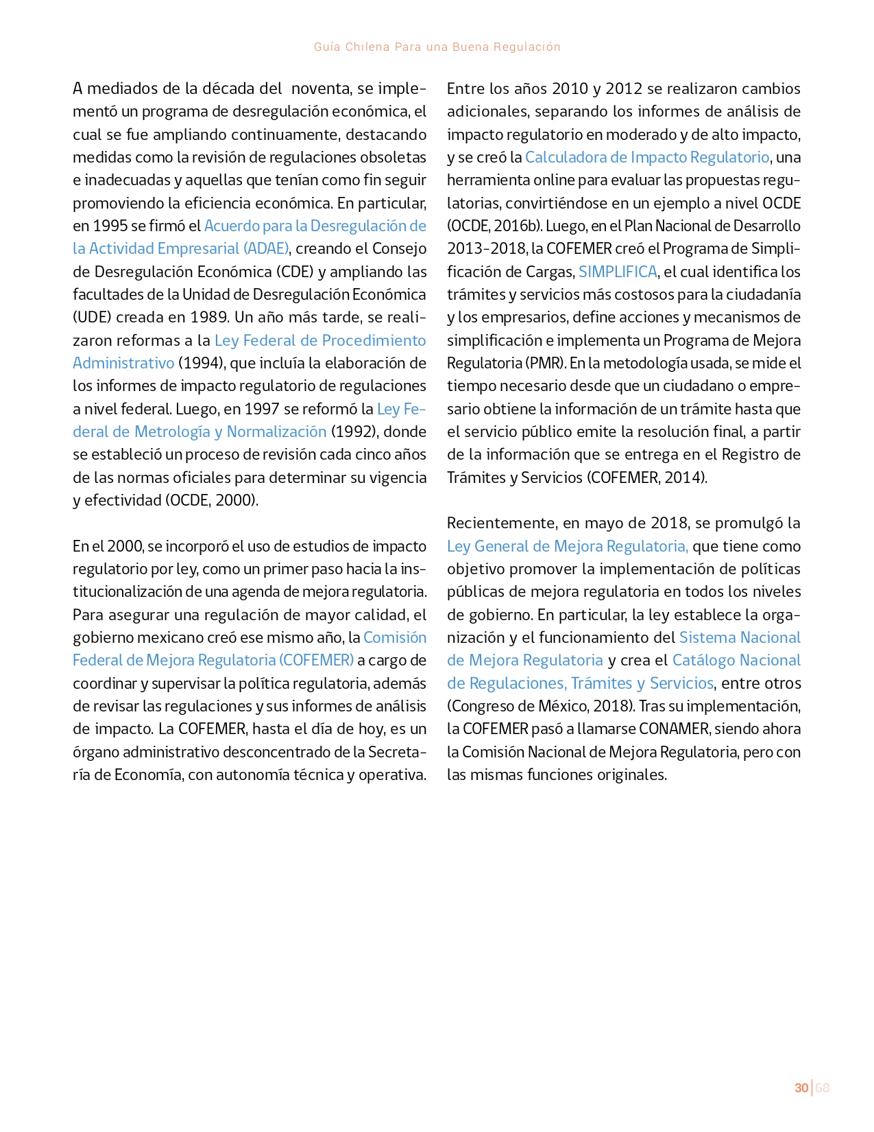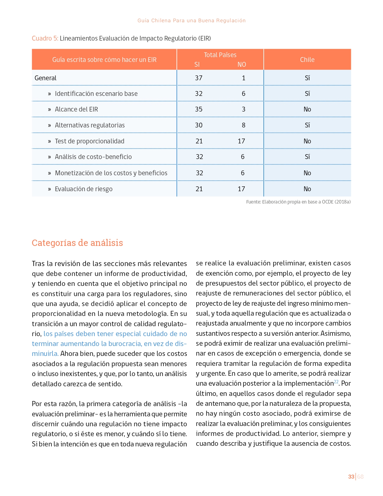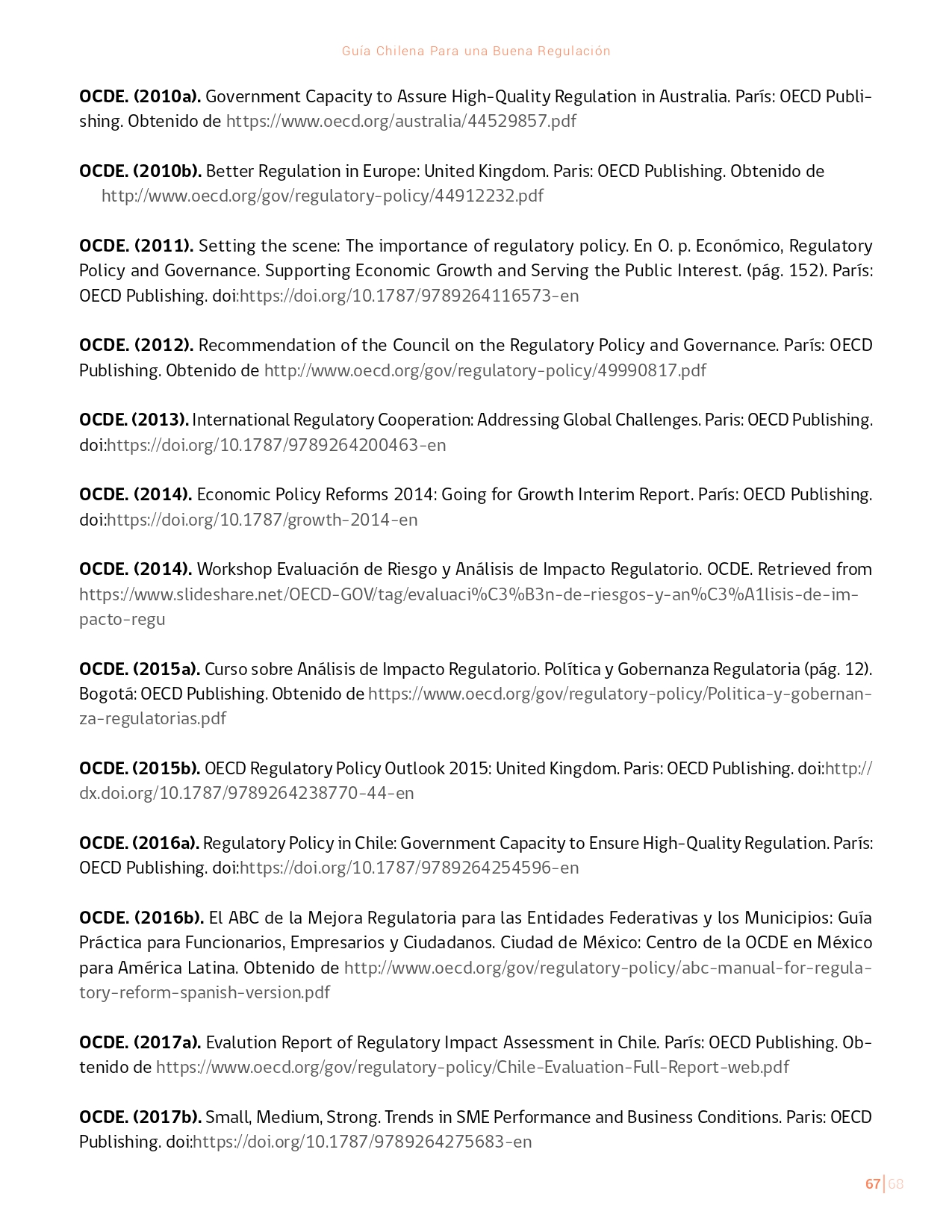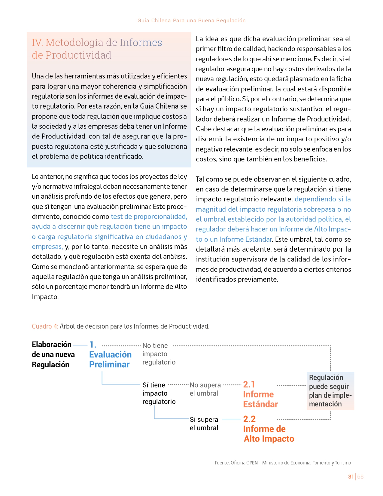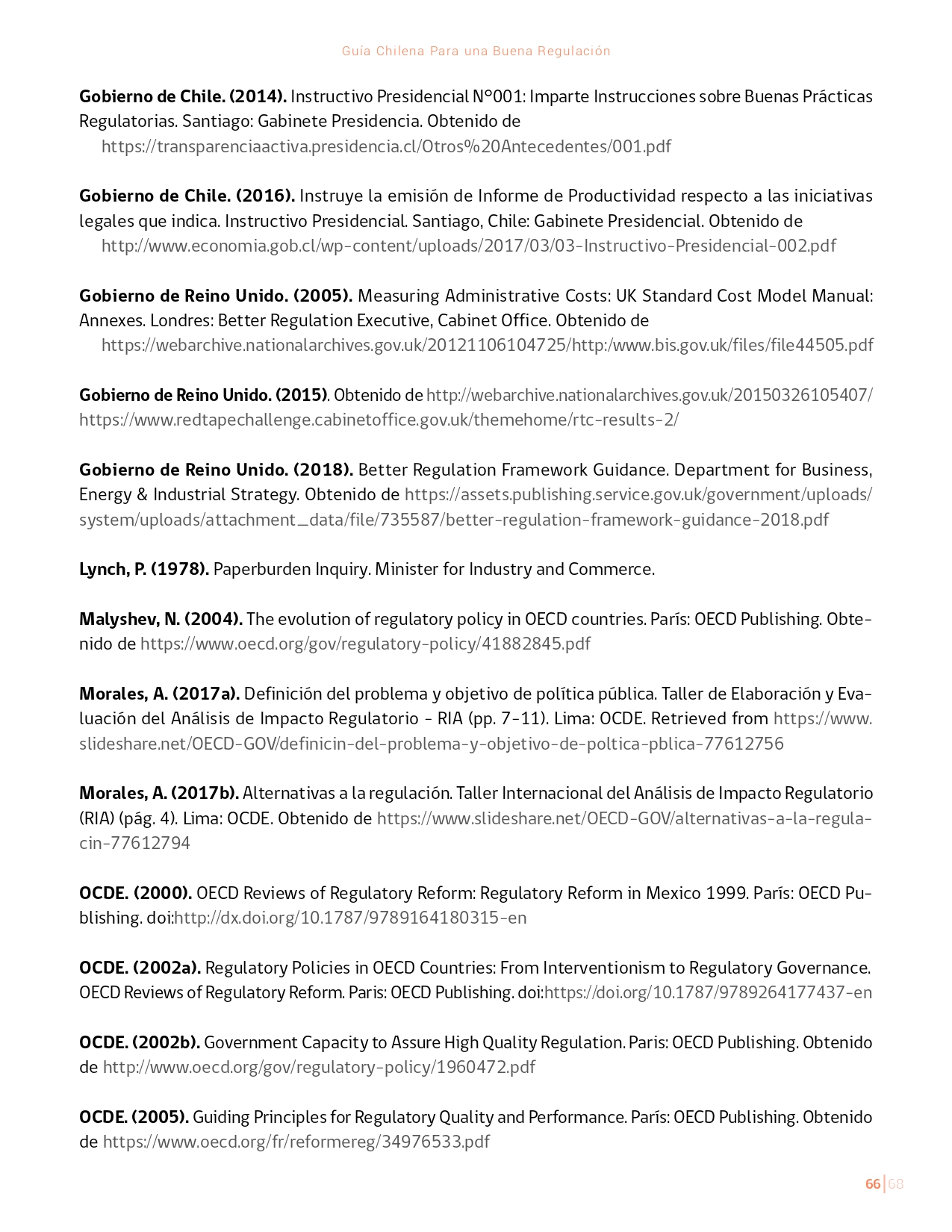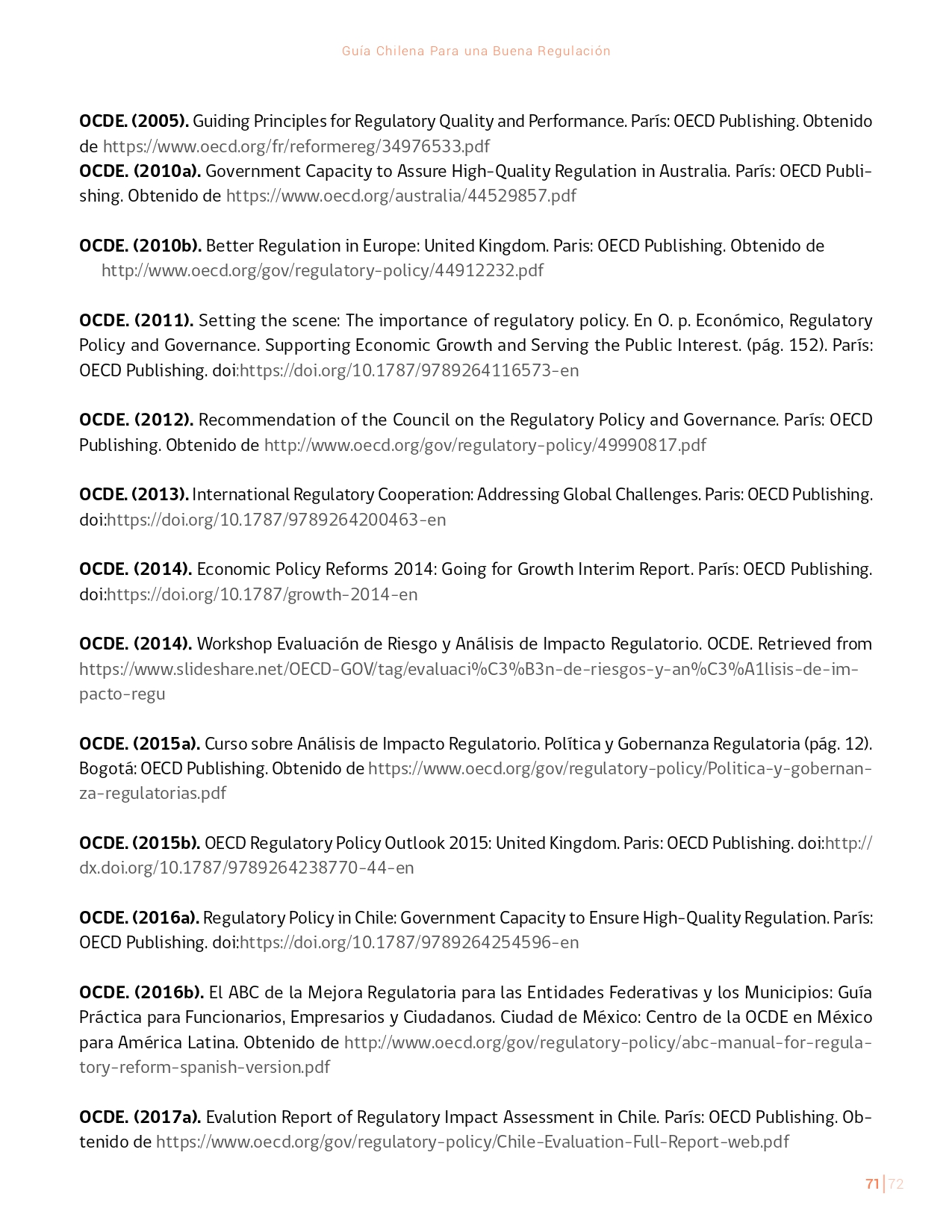 La Guía Chilena para una Buena regulación tiene como objetivo principal ser una referencia para los reguladores en el país, acompañándolos en las distintas etapas del proceso de creación de nuevas regulaciones. En ésta, se propone un proceso regulatorio transpartente que asegure la calidad de nuestro marco normativo, y dónde se releve la importancia de contar con una regulación inteligente. A través del enfoque propuesto, se promueve un análisis integral e imparcial que considera los aspectos económicos, sociales y medioambientales, evaluando a su vez, la efectividad y consistencia de las regulaciones en el tiempo. De esta forma, se evita que existan regulaciones innecesarias y costosas, las cuales no cumplen con los principios de proporcionalidad y eficiencia.