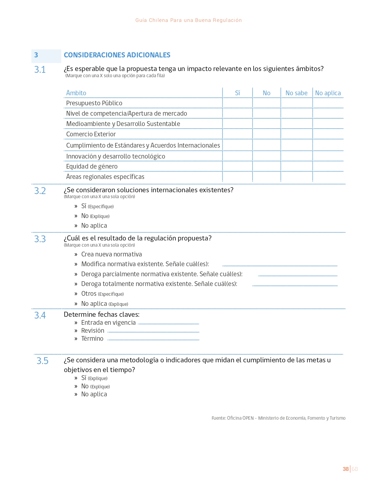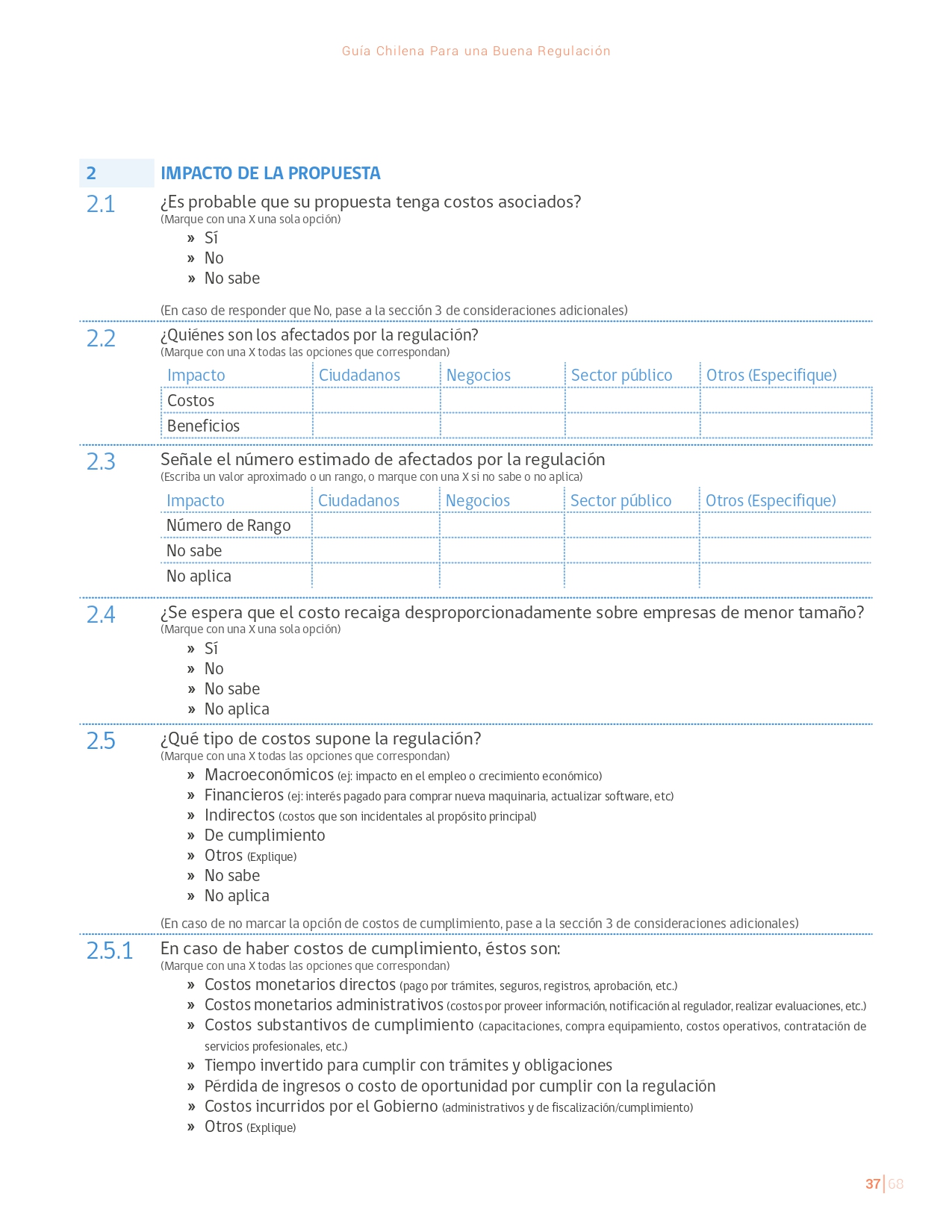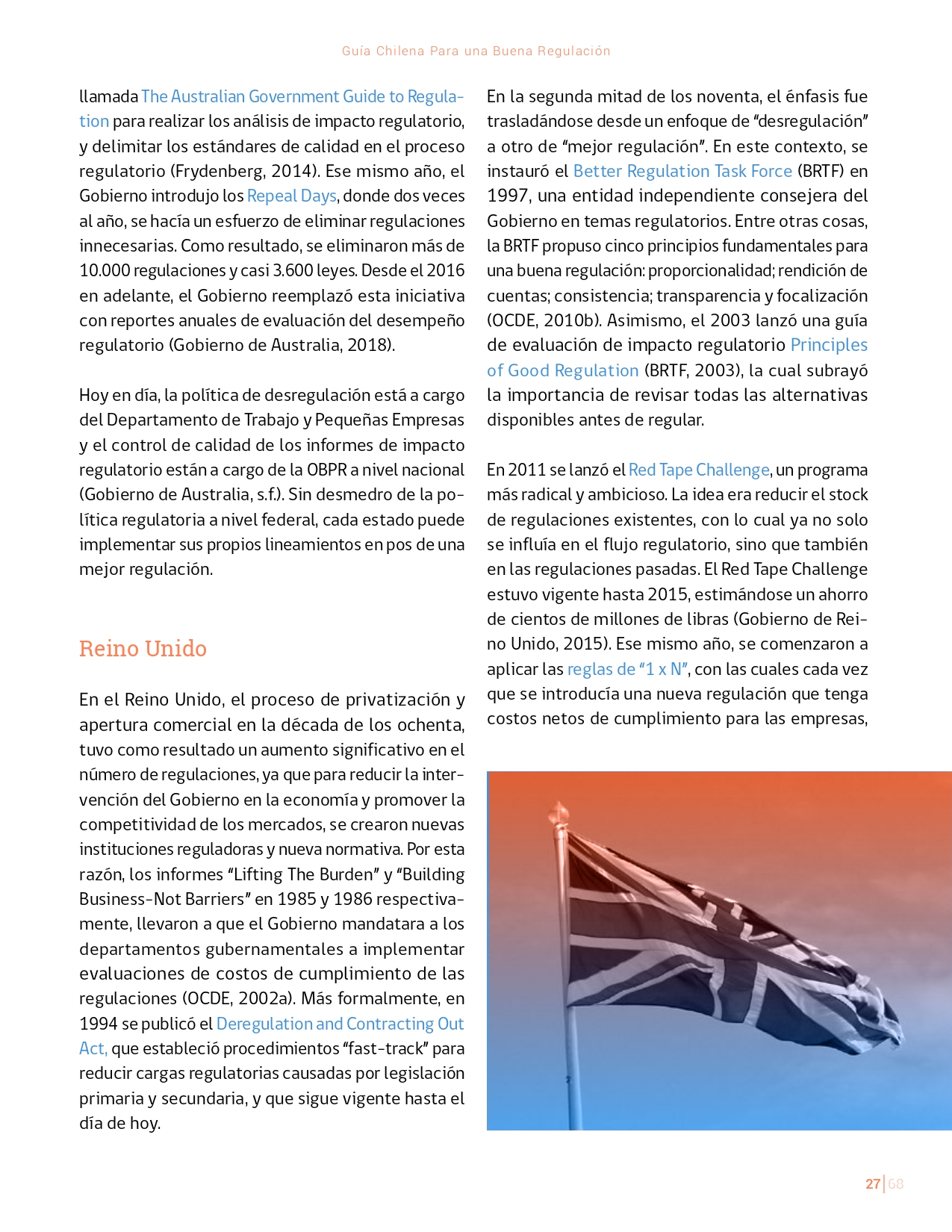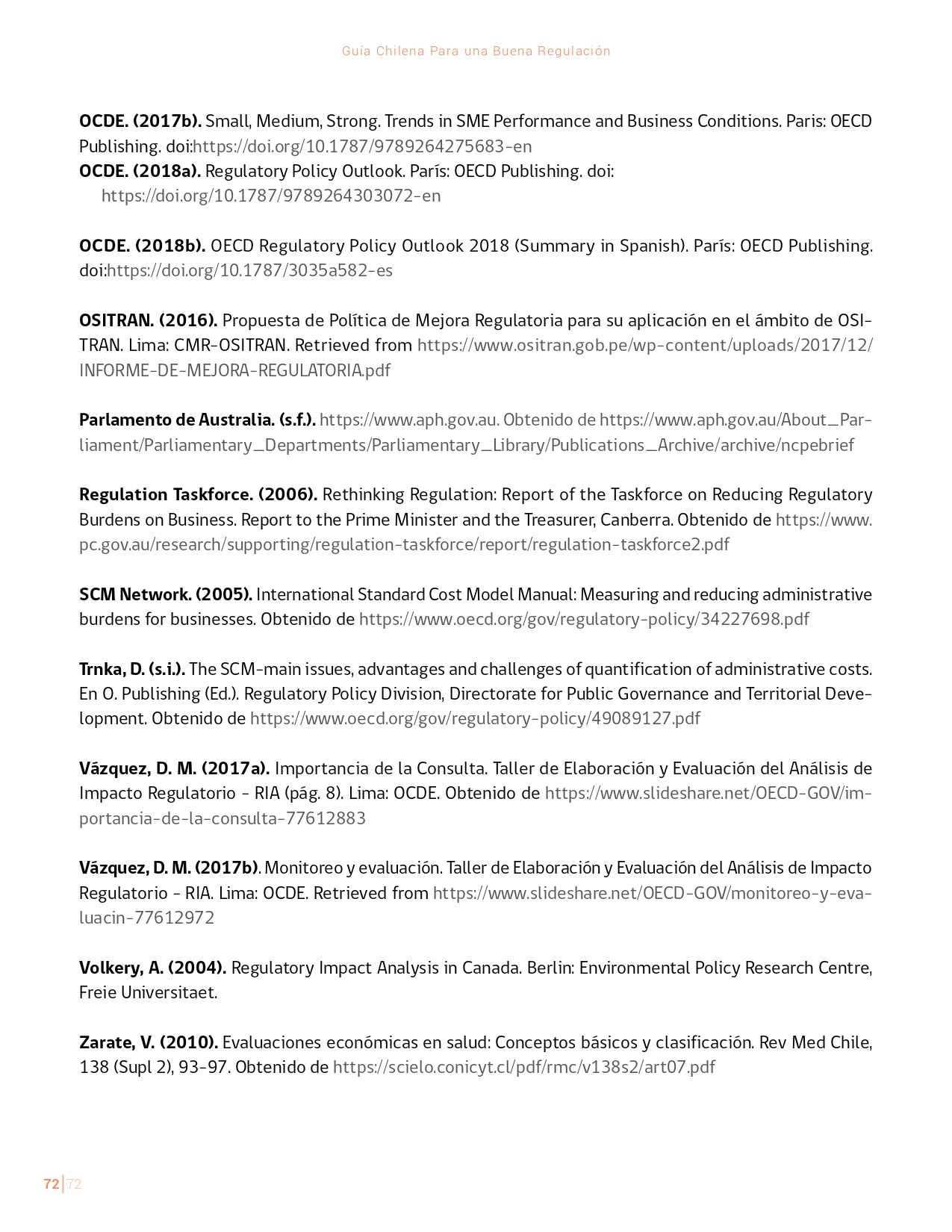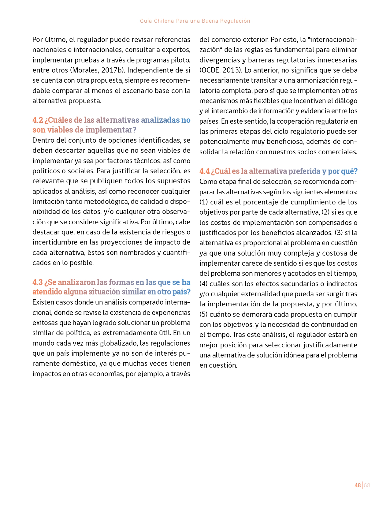 La Guía Chilena para una Buena regulación tiene como objetivo principal ser una referencia para los reguladores en el país, acompañándolos en las distintas etapas del proceso de creación de nuevas regulaciones. En ésta, se propone un proceso regulatorio transpartente que asegure la calidad de nuestro marco normativo, y dónde se releve la importancia de contar con una regulación inteligente. A través del enfoque propuesto, se promueve un análisis integral e imparcial que considera los aspectos económicos, sociales y medioambientales, evaluando a su vez, la efectividad y consistencia de las regulaciones en el tiempo. De esta forma, se evita que existan regulaciones innecesarias y costosas, las cuales no cumplen con los principios de proporcionalidad y eficiencia.