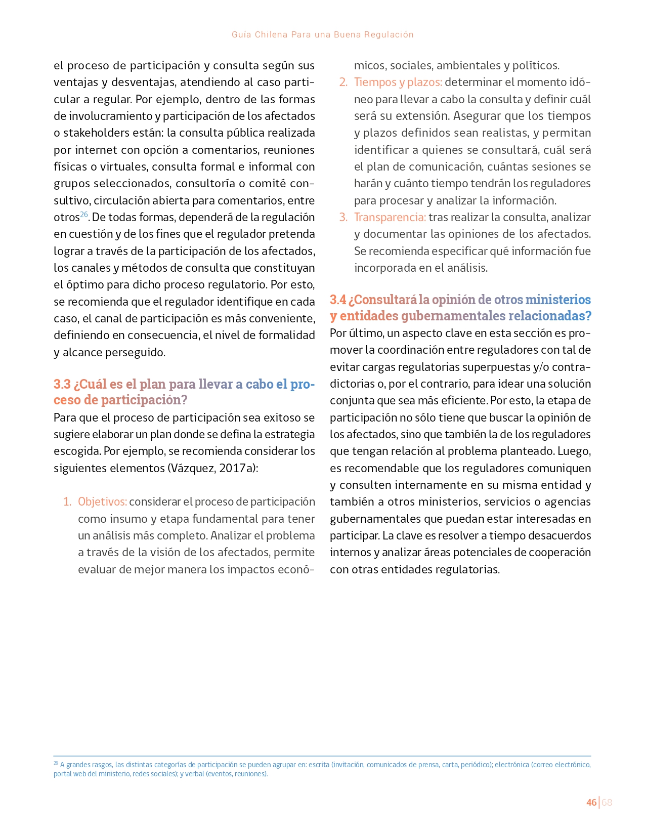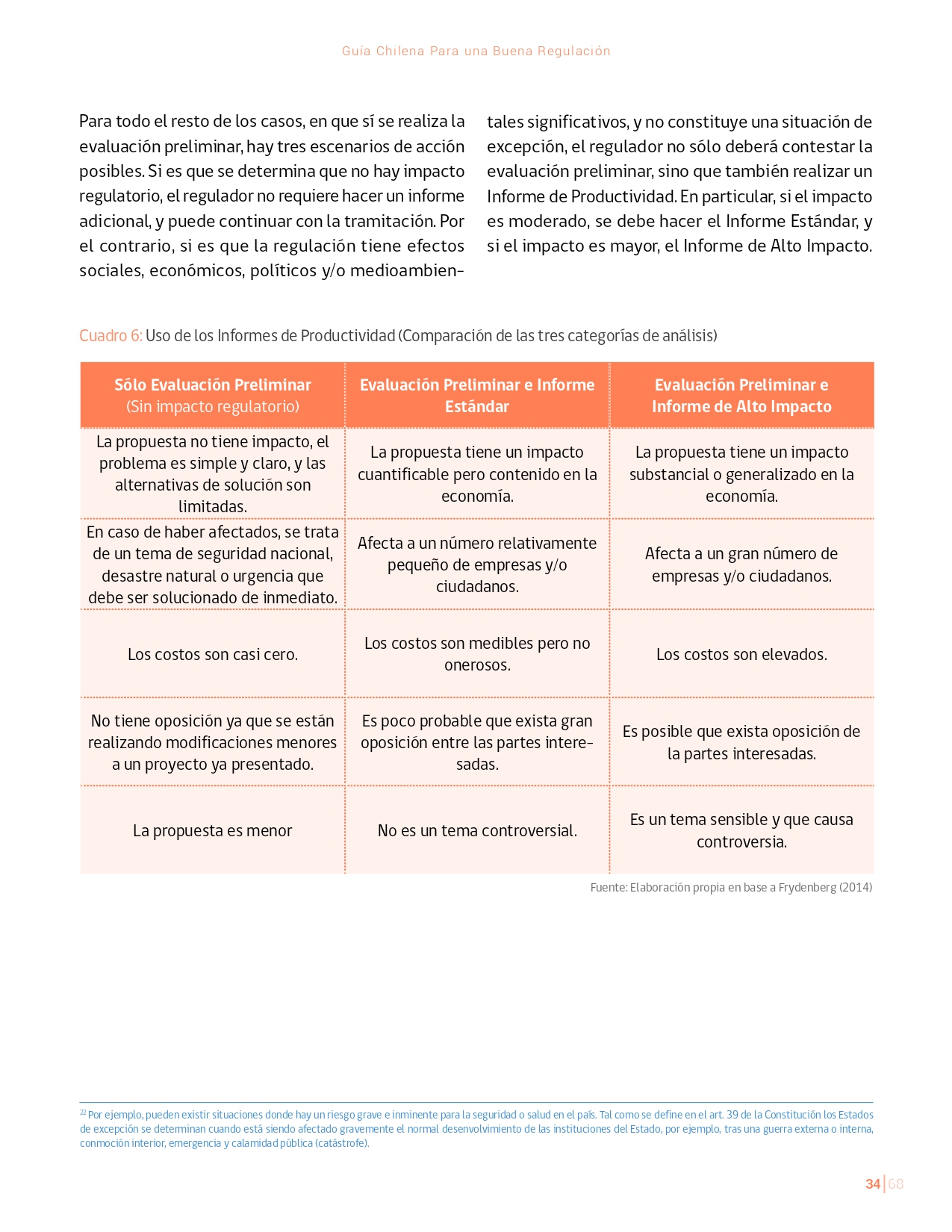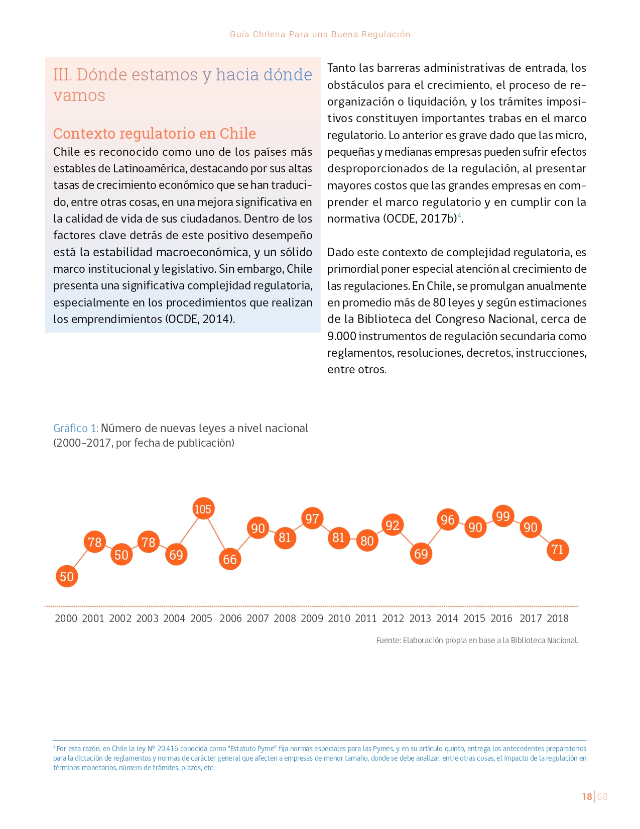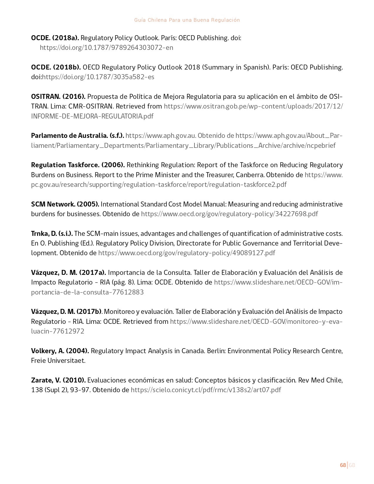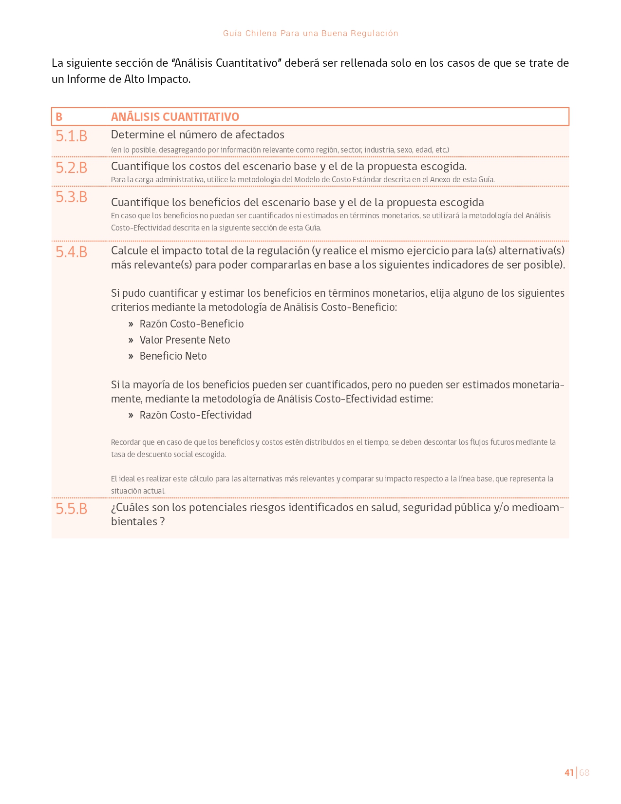 La Guía Chilena para una Buena regulación tiene como objetivo principal ser una referencia para los reguladores en el país, acompañándolos en las distintas etapas del proceso de creación de nuevas regulaciones. En ésta, se propone un proceso regulatorio transpartente que asegure la calidad de nuestro marco normativo, y dónde se releve la importancia de contar con una regulación inteligente. A través del enfoque propuesto, se promueve un análisis integral e imparcial que considera los aspectos económicos, sociales y medioambientales, evaluando a su vez, la efectividad y consistencia de las regulaciones en el tiempo. De esta forma, se evita que existan regulaciones innecesarias y costosas, las cuales no cumplen con los principios de proporcionalidad y eficiencia.