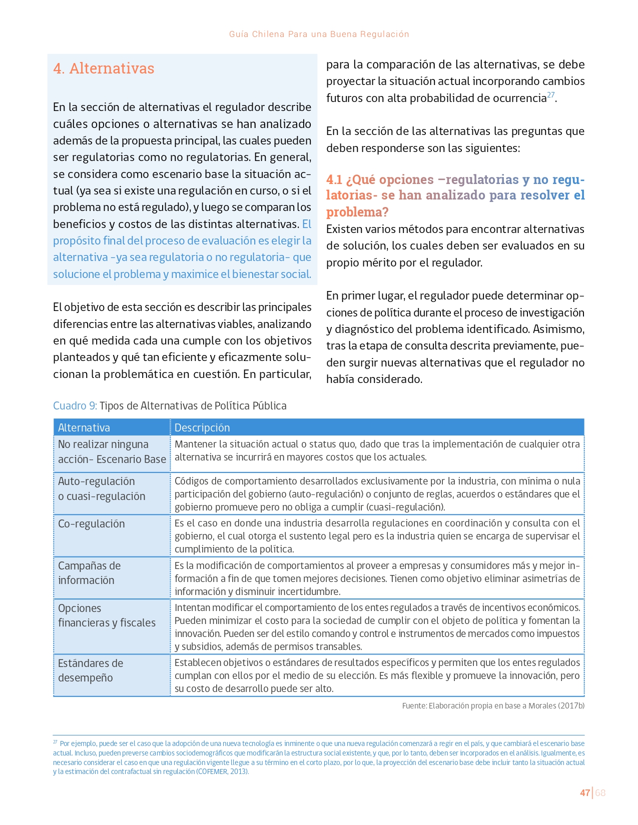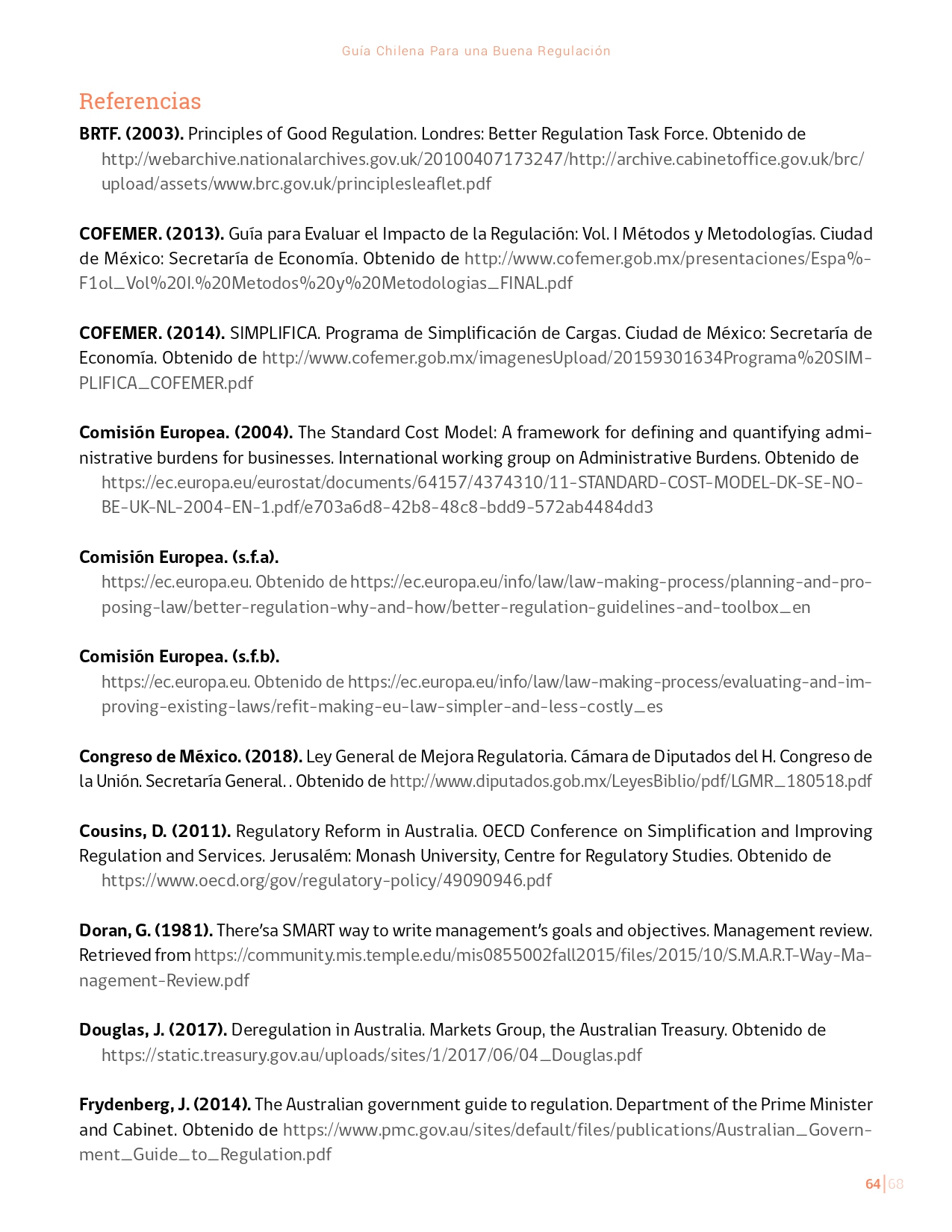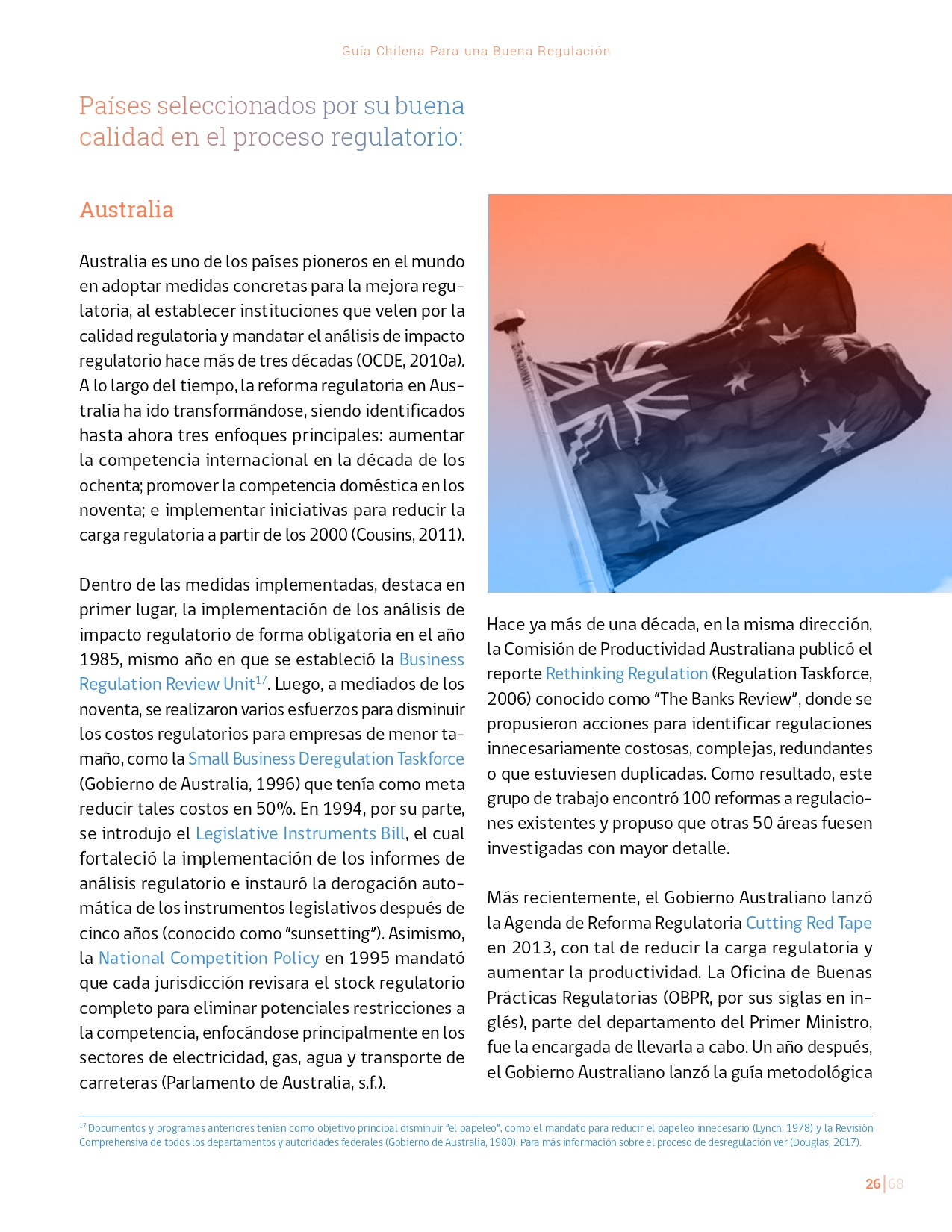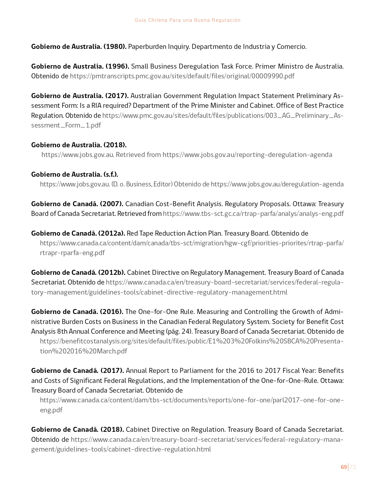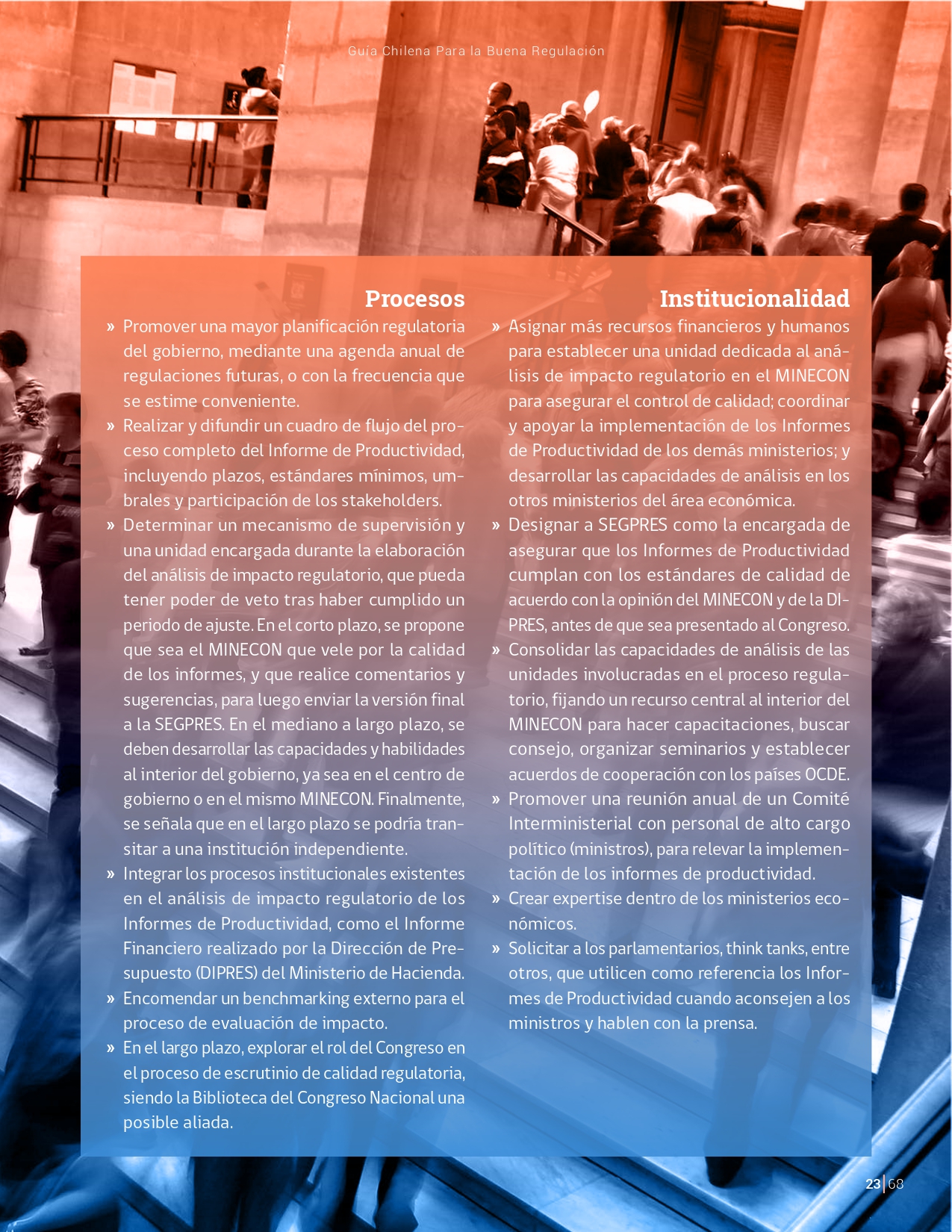 La Guía Chilena para una Buena regulación tiene como objetivo principal ser una referencia para los reguladores en el país, acompañándolos en las distintas etapas del proceso de creación de nuevas regulaciones. En ésta, se propone un proceso regulatorio transpartente que asegure la calidad de nuestro marco normativo, y dónde se releve la importancia de contar con una regulación inteligente. A través del enfoque propuesto, se promueve un análisis integral e imparcial que considera los aspectos económicos, sociales y medioambientales, evaluando a su vez, la efectividad y consistencia de las regulaciones en el tiempo. De esta forma, se evita que existan regulaciones innecesarias y costosas, las cuales no cumplen con los principios de proporcionalidad y eficiencia.